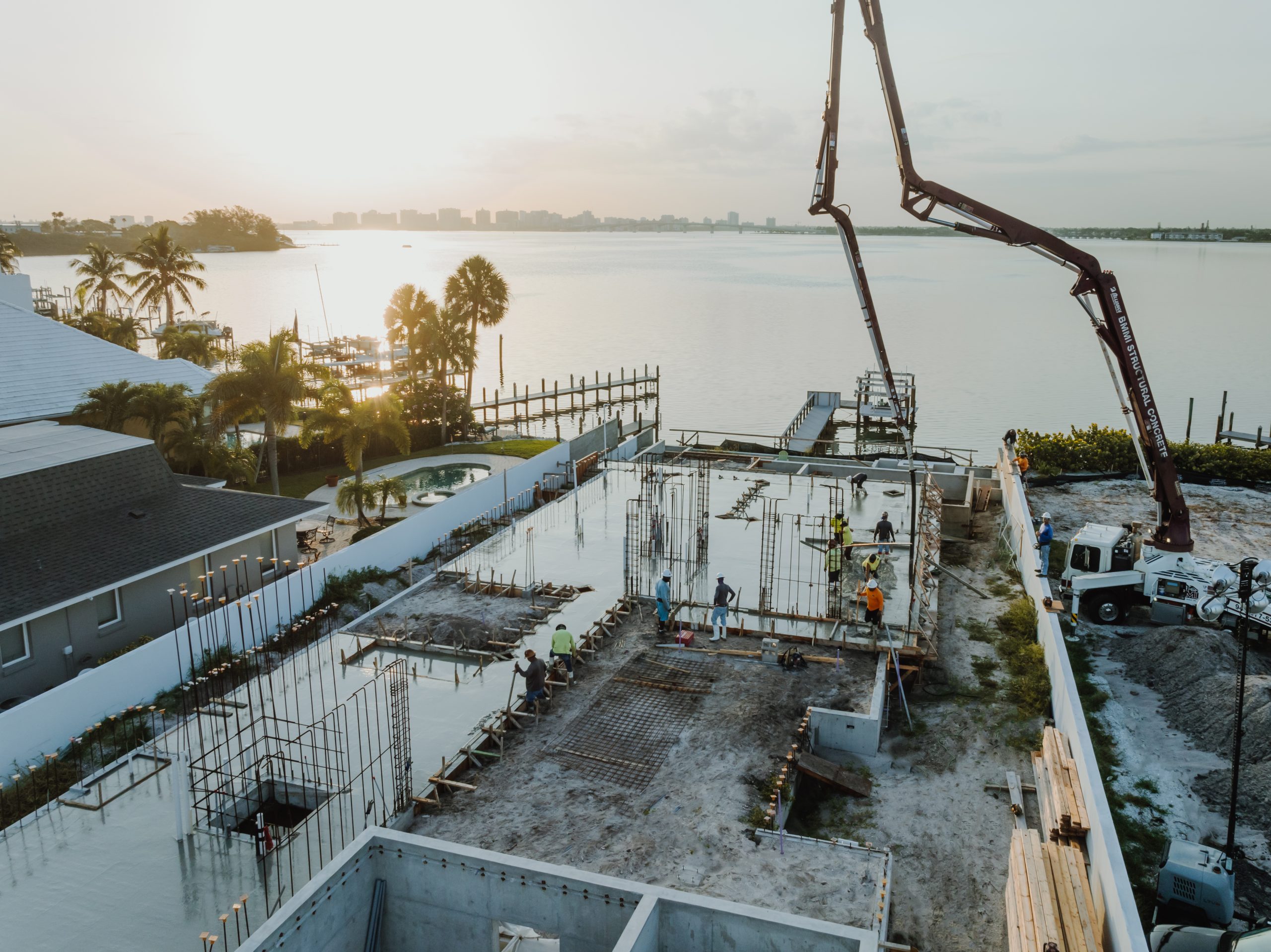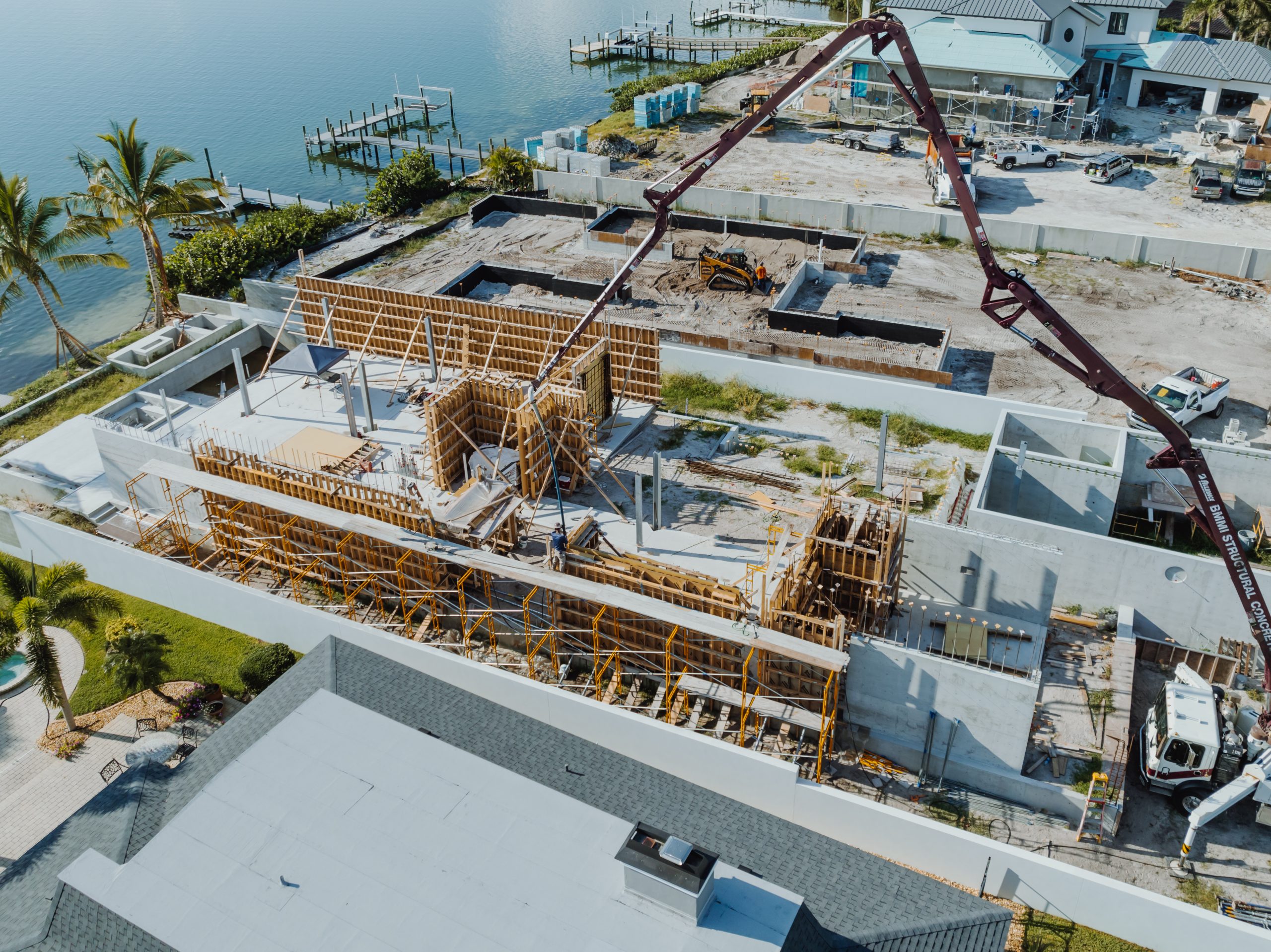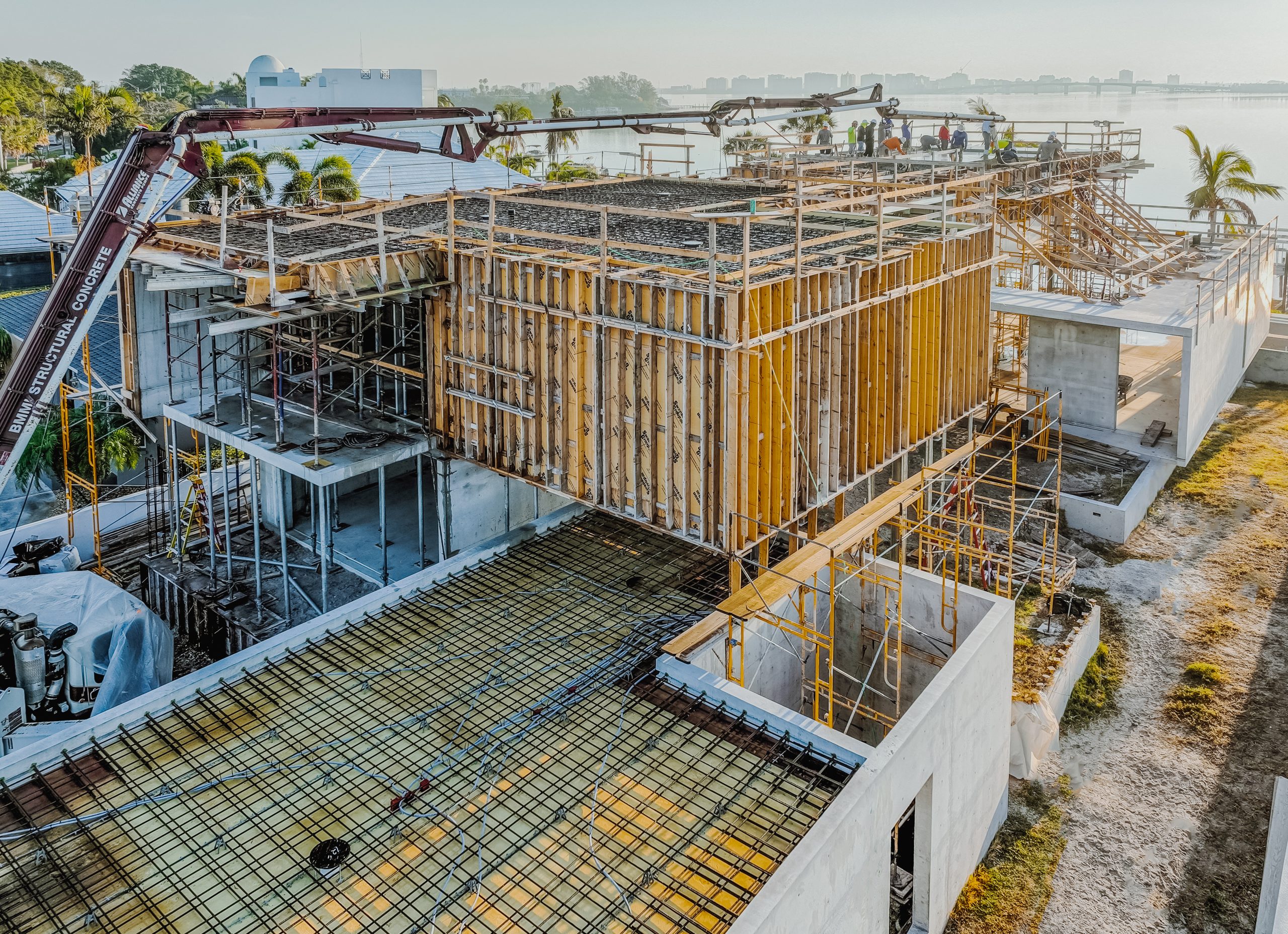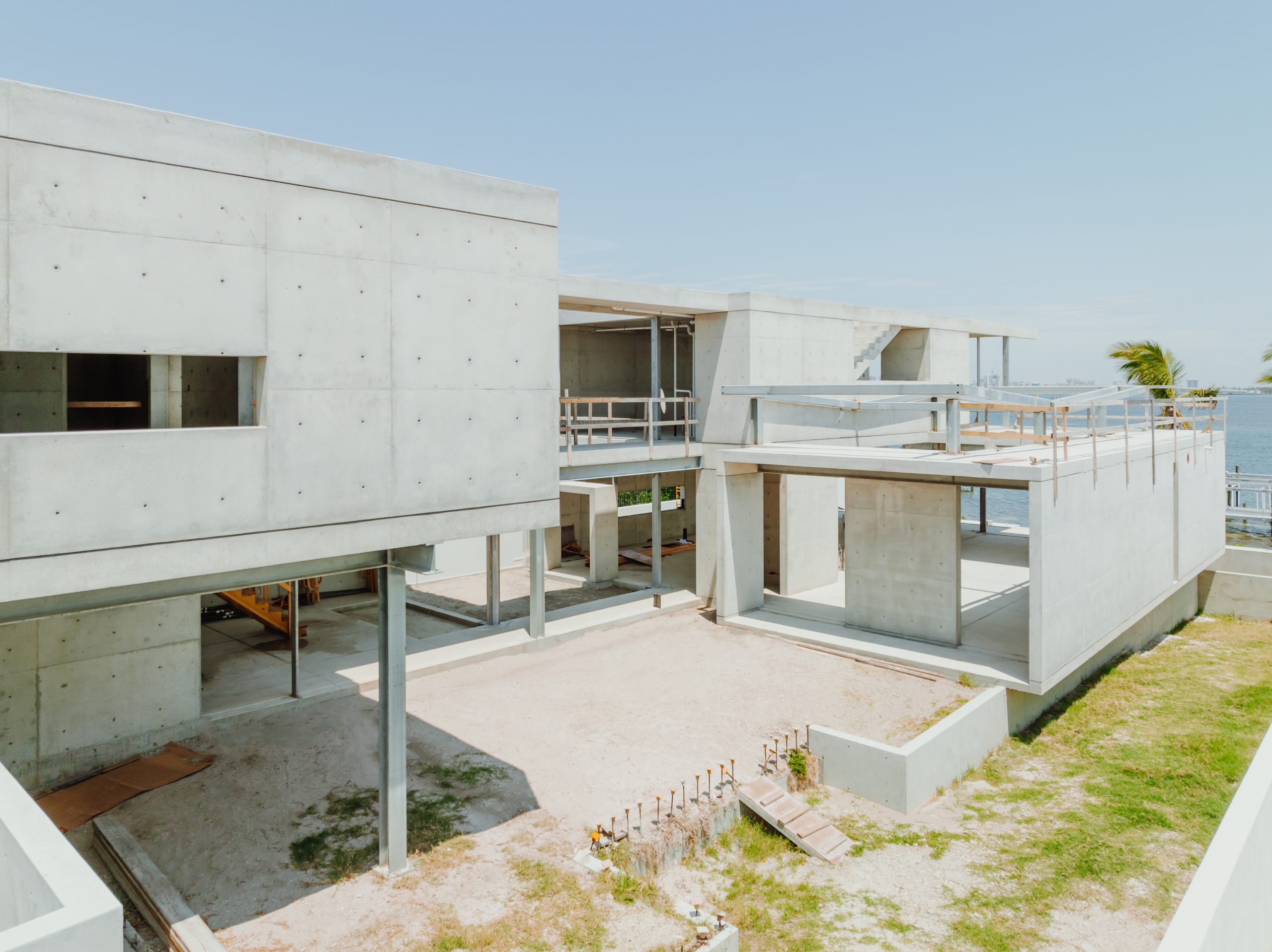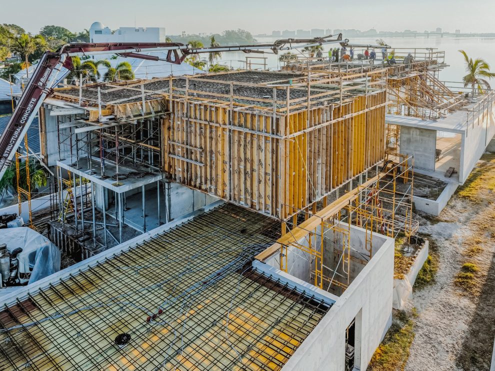 Located on Lido Key in Sarasota Florida, In-yo House required precise execution of structural concrete and masonry to achieve the architect’s design specifications while adhering to Florida’s stringent building codes. Featuring tall, smooth shear walls and intricate architectural details, the design demanded innovative forming techniques and strategic use of scaffolding.