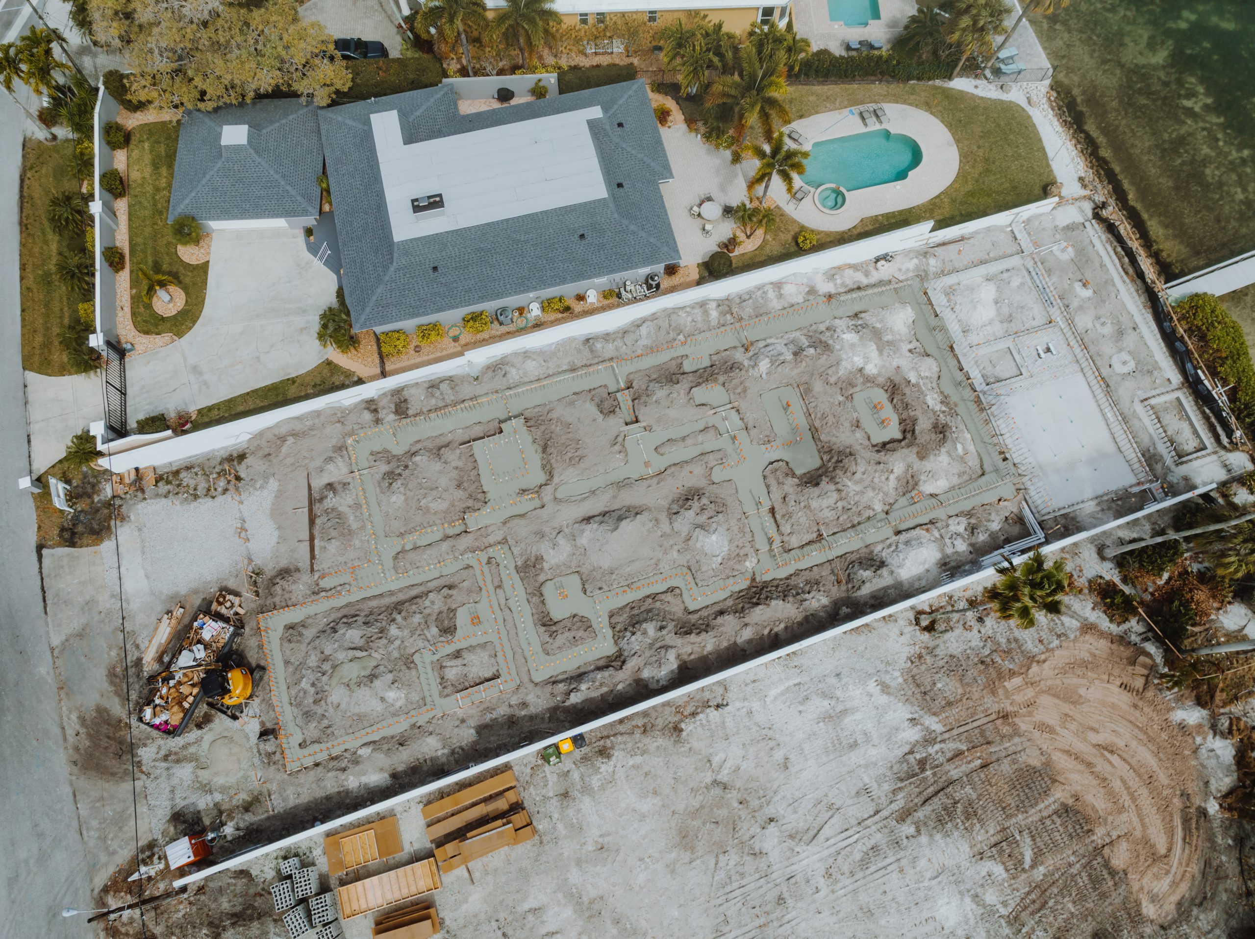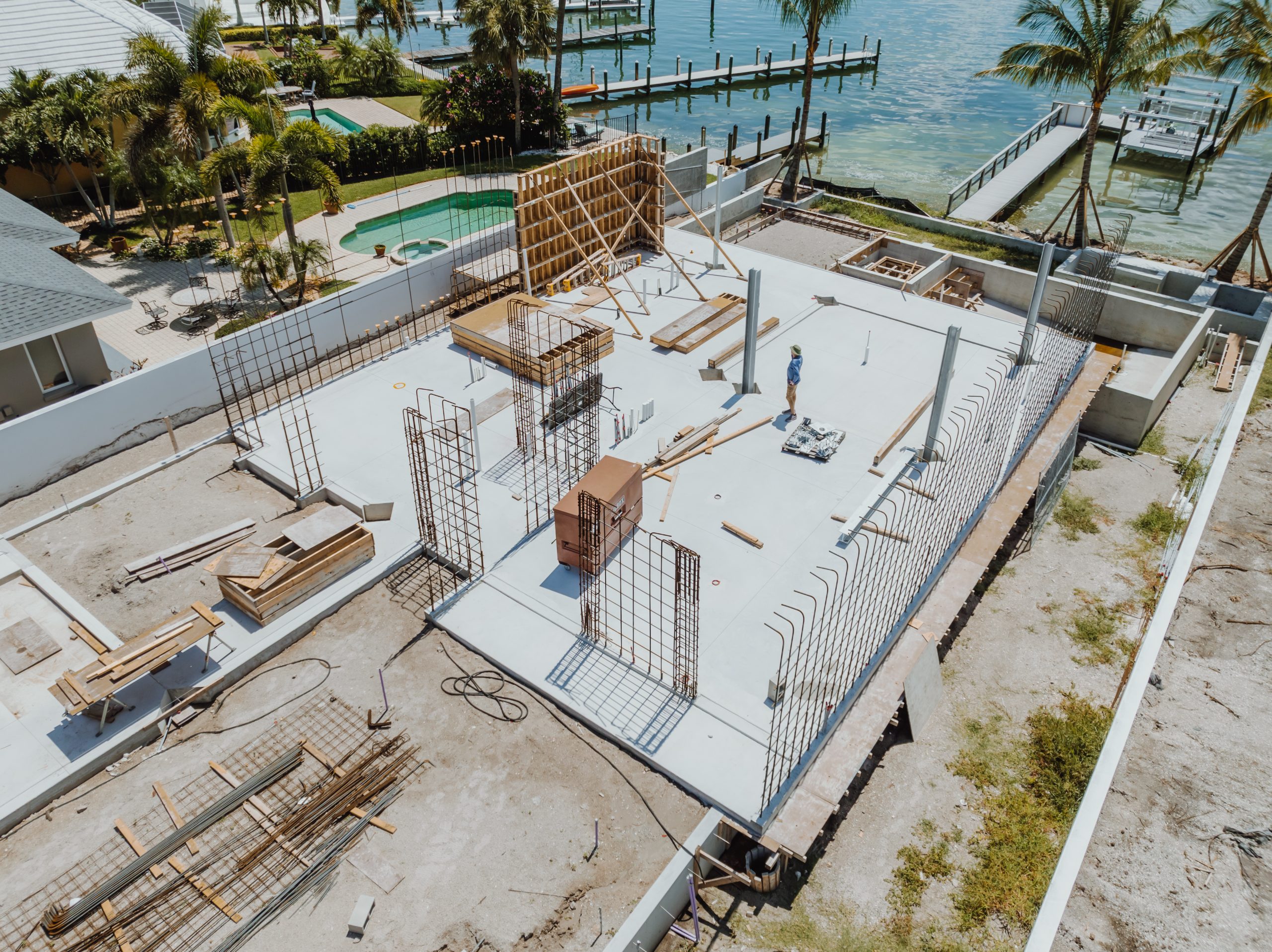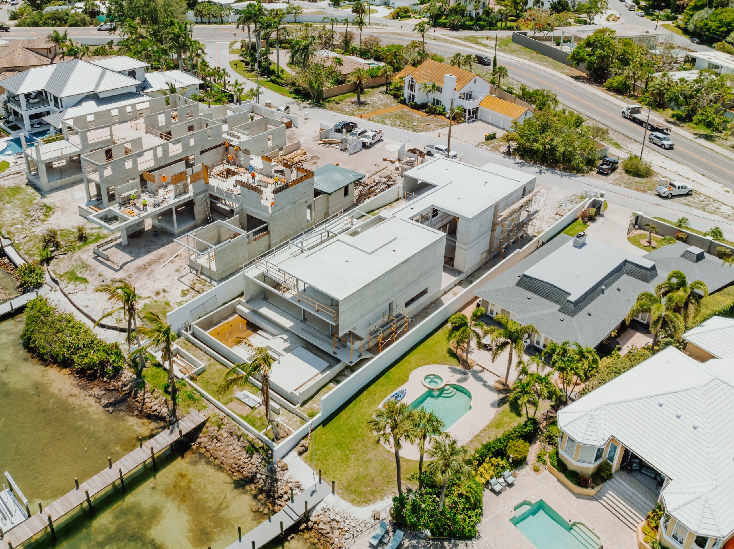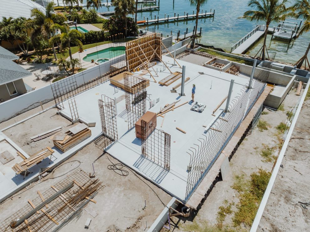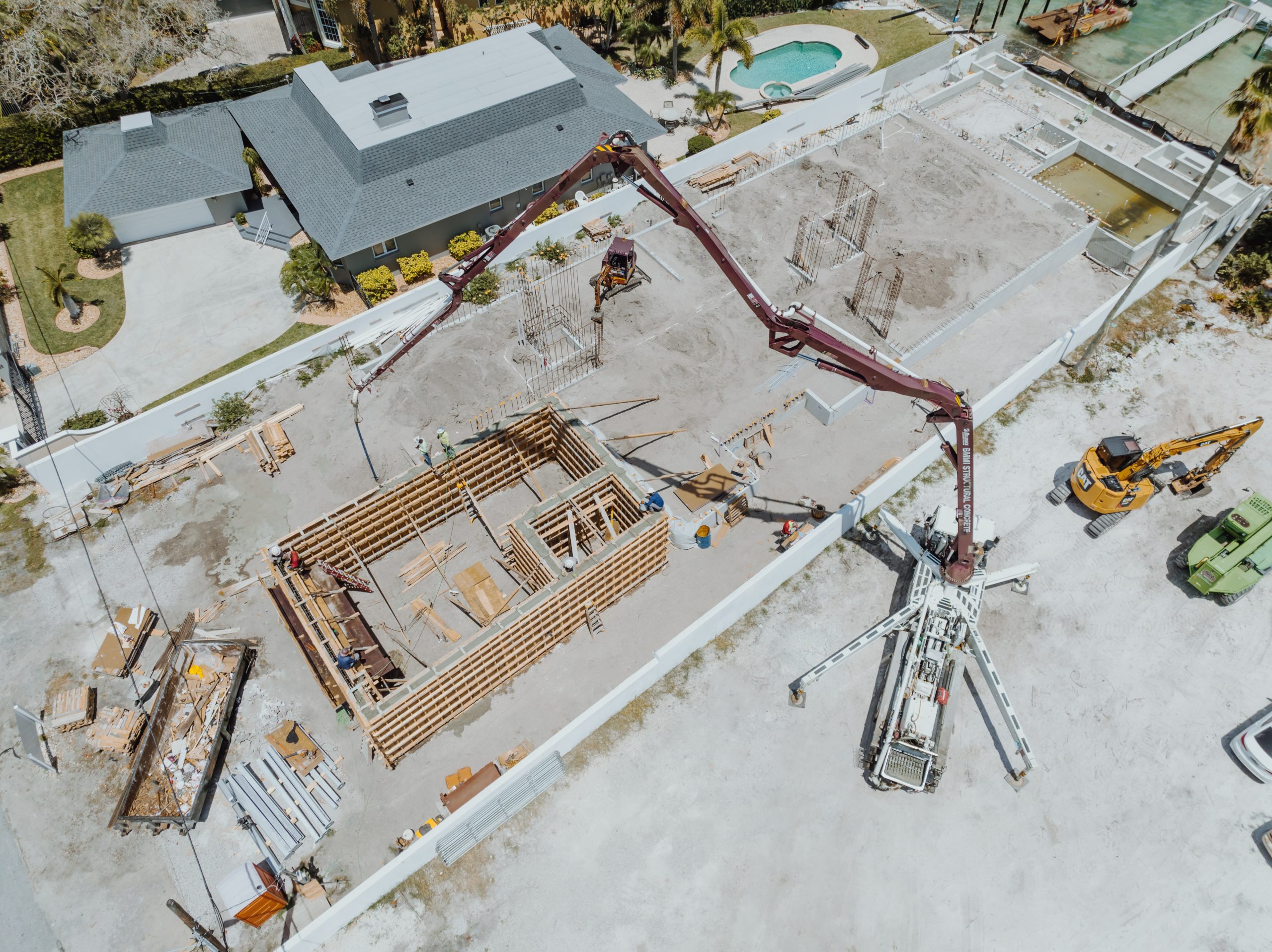 Located on Lido Key in Sarasota Florida, In-yo House required precise execution of structural concrete and masonry to achieve the architect’s design specifications while adhering to Florida’s stringent building codes. Featuring tall, smooth shear walls and intricate architectural details, the design demanded innovative forming techniques and strategic use of scaffolding.